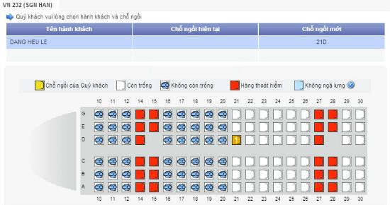 Đối với hãng hàng không Vietjet Air, bạn có thể chọn chỗ ngồi khi đến với mục dưới đây với sơ đồ máy bay hiện ra. Ký hiệu ghế trống có màu xanh, ghế đã bị chọn có màu nâu. Bạn thích chỗ nào thì có thể dùng chuột click vào để chọn.