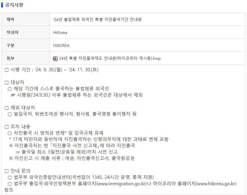 Ngày 25/09/2024, Bộ Tư pháp Hàn Quốc thông báo chính sách truy quét và ân xá đối với người lao động nước ngoài cư trú bất hợp pháp tại Hàn Quốc tự nguyện về nước trong thời gian từ 30/09/2024 đến hết ngày 30/11/2024, cụ thể như sau: