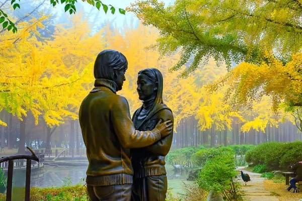 Vẻ đẹp tuyệt vời của đảo Nami đã gắn liền với tên tuổi của bộ phim truyền hình Hàn Quốc nổi tiếng “Bản tình ca mùa đông” đã từng “làm mưa làm gió” khắp Châu Á. Do vậy, khi đến đây bạn đừng quên chụp ảnh check-in tại bức tượng cặp đôi nhân vật chính Bae Yong Joon và Choi Ji Woo trong bộ phim này nhé.
