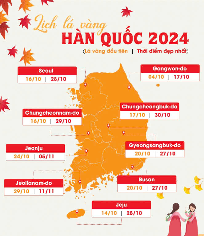 Sau mùa hoa anh đào, mùa thu với lá vàng rực rỡ là thời điểm được các tín đồ du lịch săn đón nhất khi muốn đến Hàn Quốc. Tuy nhiên, bạn cần cập nhật bản đồ lá vàng mùa thu Hàn Quốc để sắp xếp chuyến đi đúng vào cao điểm của mùa cây thay lá, và thường diễn ra trong thời gian ngắn, chỉ từ 1-2 tuần. Hãy lưu lại ngay lịch lá vàng Hàn Quốc 2024 của Hàn Việt ở dưới đây nhé.