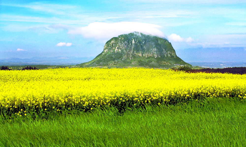 Thoạt nhìn, Seongsan Ilchulbong trông giống như một pháo đài với những tảng đá chắc chắn. Nhưng sự thực thì đây là một ngọn núi lửa không còn hoạt động, cũng giống núi Hallasan. Nó được hình thành bởi những đợt dung nham phun trào dưới đáy biển hơn 100,000 năm trước đây, và được nối với đất liền bởi một dải đất hẹp, rất lý tưởng để tản bộ hoặc đi xe ngựa đến làng Seongsan gần đó. Vào mùa xuân, núi Seongsan Ilchulbong rực vàng hoa cải dầu, bạn chắc chắn sẽ chụp được những bức ảnh đẹp hoàn hảo giữa một cánh đồng hoa cải rộng lớn trên đỉnh núi lửa!