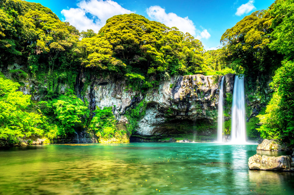 Đảo Jeju là một thiên đường cho những người yêu thiên nhiên với những bãi đá tự nhiên, các bãi biển và các thác nước trong vắt. Còn được biết đến với cái tên Hồ nước của Chúa Trời, thác Cheonjiyeon bắt nguồn từ trần của mọt hang động, và có ba khu vực, đổ dần ra biển. Xung quanh thác là hệ động thực vật phong phú. Bạn có thể tìm thấy cây sậy Solipnan rất hiếm và dương xỉ Skeleton Fork – chắc chắn sẽ làm các nhà sinh vật học chuyên nghiệp và nghiệp dư đều sướng rơn! Nếu bạn đến thăm thác Cheonjiyeon vào tháng 5, đừng quên mang theo đồ bơi vì bạn có thể xuống tắm ở đây đó!