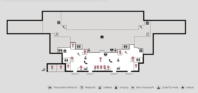 Tầng 1: Sảnh Đến. Tại đây hành khách sẽ nhận hành lý ký gửi, và lựa chọn các phương tiện giao thông để về trung tâm thành phố như xe bus, taxi hoặc là thuê xe hơi.