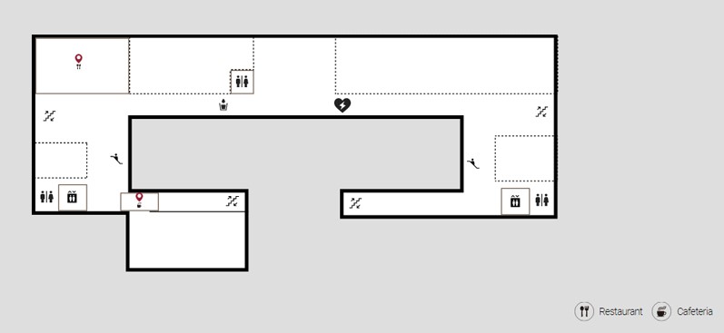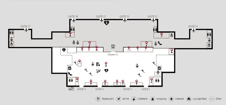 Tầng 2: Sảnh Khởi hành. Tầng này có quầy làm thủ tục chuyến bay, kiểm tra an ninh và các lối ra tàu bay từ số 31 đến số 37.