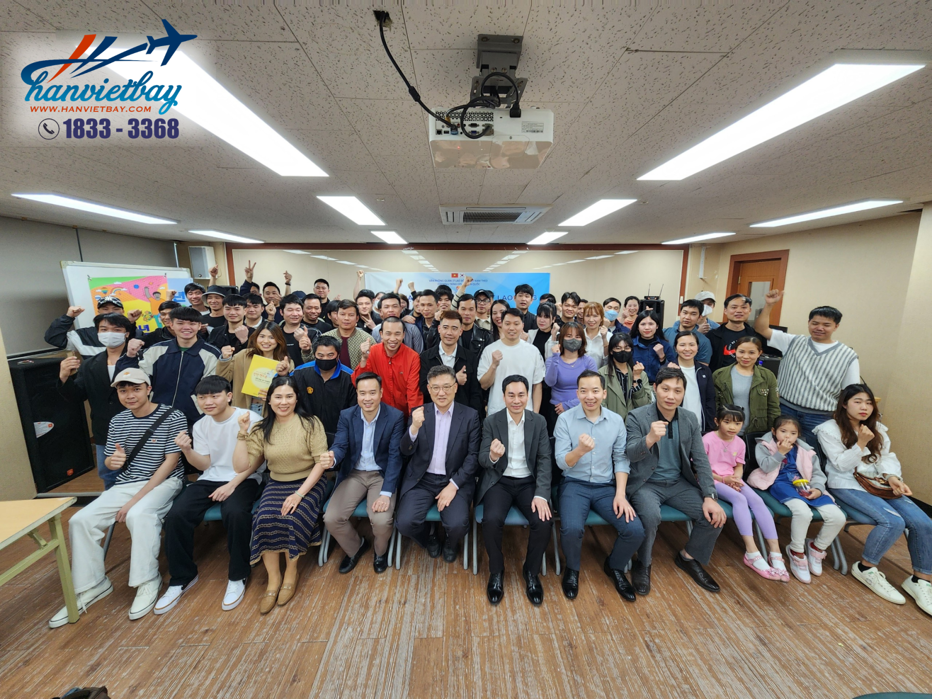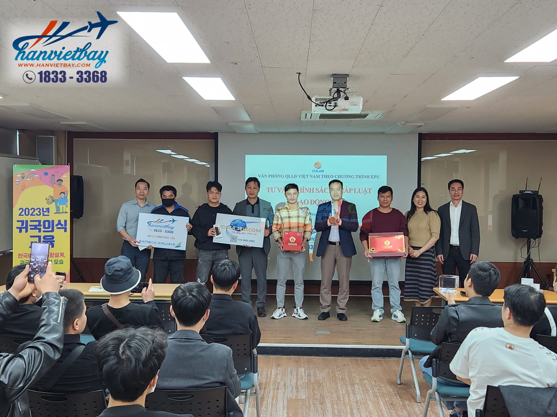 Về phía đại diện Hanvietbay cũng có những chia sẻ, cung cấp thông tin hữu ích về các thủ tục giấy tờ khi bay về nước hay lưu trú ở Hàn Quốc. Đặc biệt tại chương trình Hanvietbay cũng gửi tặng rất nhiều phần quà ý nghĩa, bốc thăm trúng thưởng vé máy bay khứ hồi cho các bạn lao động. Chúng tôi hy vọng những phần quà này và những thông tin cần thiết, hữu ích sẽ giúp cuộc sống người lao động ở Hàn Quốc thuận lợi hơn.