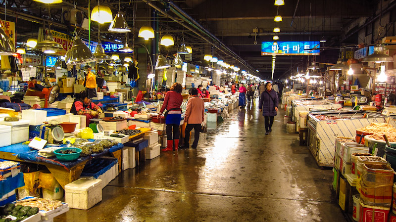 Đây là chợ thủy sản lớn nhất Hàn Quốc với lịch sử hơn 80 năm được mở 24/24. Bạn có thể tìm bất cứ loại hải sản nào từ tôm, cua, ghẹ, đến bạch tuộc, cá bơn...Với hơn 750 cửa hàng, nếu muốn mua được hải sản rẻ, bạn nên đến chợ lúc 5h sáng.