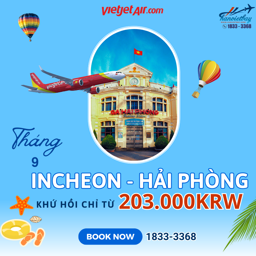 Chỉ từ 203.000KRW có ngay tấm vé Vietjet bay thẳng Incheon - Hải Phòng dịp Trung thu (có 7Kg xách tay + 20Kg Ký gửi). Liên hệ ngay với Hanvietbay để book vé thôi mọi người ơi!